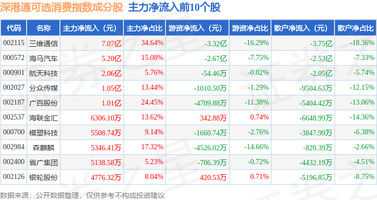 资金流向方面,深港通可选消费(983019)指数成份股当日主力资金净流出合计28.42亿元,游资资金净流入合计8865.86万元,散户资金净流入合计27.54亿元。成份股资金流向详情见下表: