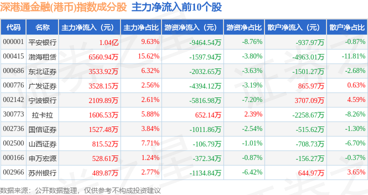 资金流向方面,深港通金融(港币)(983026)指数成份股当日主力资金净流出合计1.87亿元,游资资金净流出合计1.67亿元,散户资金净流入合计3.54亿元。成份股资金流向详情见下表: