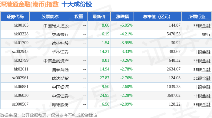 深港通金融(港币)(983026)指数十大成份股详情如下: