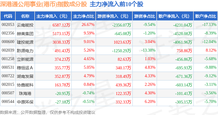 资金流向方面,深港通公用事业(港币)(983032)指数成份股当日主力资金净流出合计2.58亿元,游资资金净流入合计2110.11万元,散户资金净流入合计2.37亿元。成份股资金流向详情见下表: