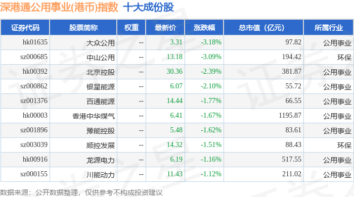 深港通公用事业(港币)(983032)指数十大成份股详情如下: