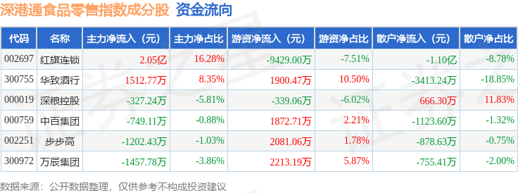 资金流向方面,深港通食品零售(983037)指数成份股当日主力资金净流入合计1.82亿元,游资资金净流出合计1700.63万元,散户资金净流出合计1.65亿元。成份股资金流向详情见下表: