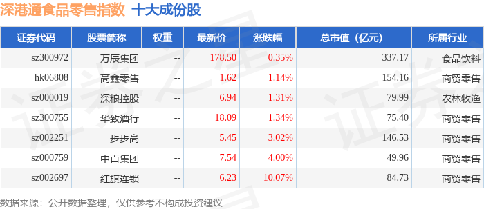 证券之星消息,12月15日,深港通食品零售(983037)指数报收于2367.27点,涨3.04%,成交39.01亿元,换手率3.87%。当日该指数成份股中,上涨的有7家,红旗连锁以10.07%的涨幅领涨。