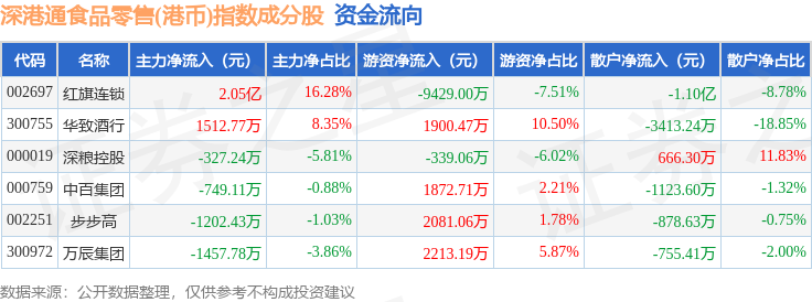 资金流向方面,深港通食品零售(港币)(983038)指数成份股当日主力资金净流入合计1.82亿元,游资资金净流出合计1700.63万元,散户资金净流出合计1.65亿元。成份股资金流向详情见下表: