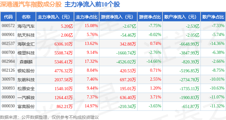 资金流向方面,深港通汽车(983039)指数成份股当日主力资金净流出合计4.94亿元,游资资金净流出合计9470.19万元,散户资金净流入合计5.88亿元。成份股资金流向详情见下表: