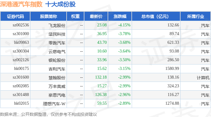 证券之星消息,12月15日,深港通汽车(983039)指数报收于7610.21点,跌1.73%,成交318.43亿元,换手率1.57%。当日该指数成份股中,上涨的有20家,海马汽车以5.57%的涨幅领涨,下跌的有73家,飞龙股份以4.15%的跌幅领跌。