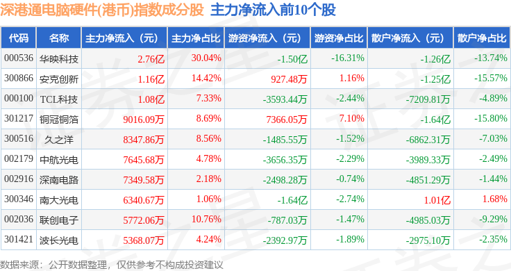 资金流向方面,深港通电脑硬件(港币)(983044)指数成份股当日主力资金净流出合计90.76亿元,游资资金净流入合计16.74亿元,散户资金净流入合计74.02亿元。成份股资金流向详情见下表: