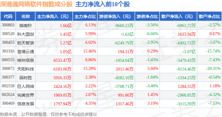 资金流向方面,深港通网络软件(983047)指数成份股当日主力资金净流出合计19.05亿元,游资资金净流入合计8356.79万元,散户资金净流入合计18.21亿元。成份股资金流向详情见下表: