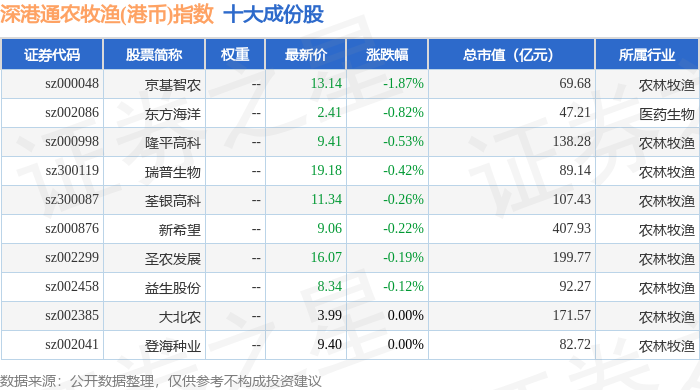 深港通农牧渔(港币)(983052)指数十大成份股详情如下:
