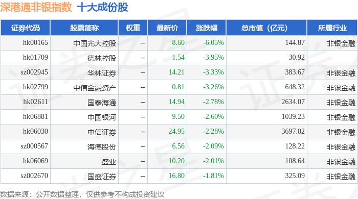 证券之星消息,12月15日,深港通非银(983053)指数报收于7137.43点,涨0.47%,成交257.58亿元,换手率0.66%。当日该指数成份股中,上涨的有31家,远东宏信以6.89%的涨幅领涨,下跌的有23家,中国光大控股以6.05%的跌幅领跌。