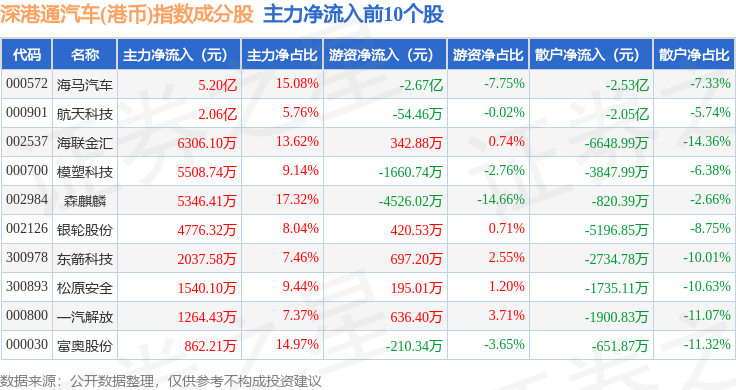 资金流向方面,深港通汽车(港币)(983040)指数成份股当日主力资金净流出合计4.94亿元,游资资金净流出合计9470.19万元,散户资金净流入合计5.88亿元。成份股资金流向详情见下表: