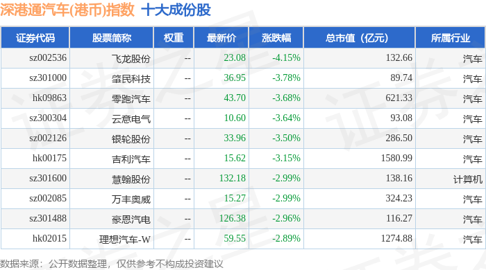 深港通汽车(港币)(983040)指数十大成份股详情如下: