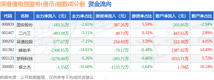 资金流向方面,深港通电信服务(港币)(983058)指数成份股当日主力资金净流出合计2.23亿元,游资资金净流出合计1204.92万元,散户资金净流入合计2.35亿元。成份股资金流向详情见下表: