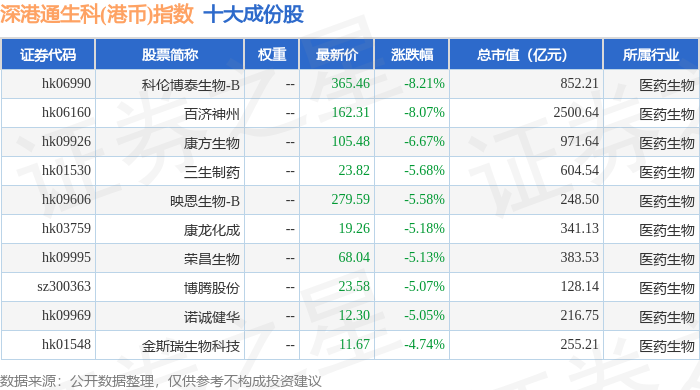 深港通生科(港币)(983060)指数十大成份股详情如下: