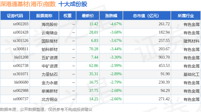 深港通基材(港币)(983062)指数十大成份股详情如下: