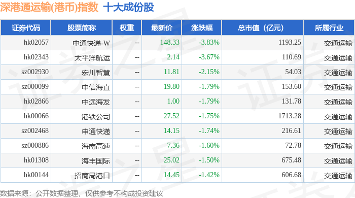 深港通运输(港币)(983078)指数十大成份股详情如下: