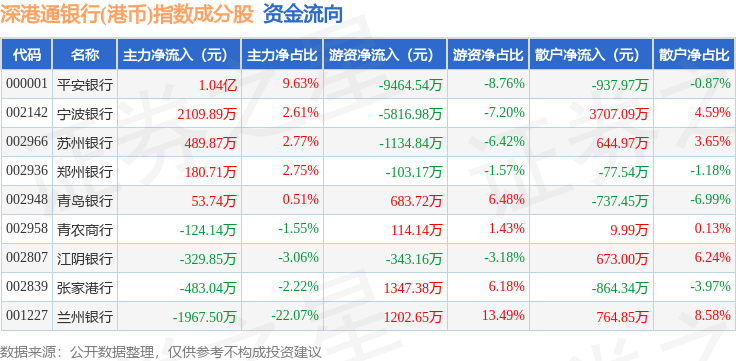 资金流向方面,深港通银行(港币)(983082)指数成份股当日主力资金净流入合计1.03亿元,游资资金净流出合计1.35亿元,散户资金净流入合计3182.6万元。成份股资金流向详情见下表: