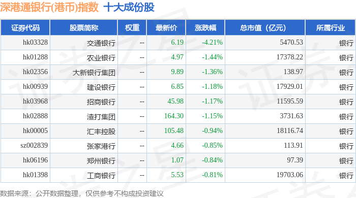 深港通银行(港币)(983082)指数十大成份股详情如下: