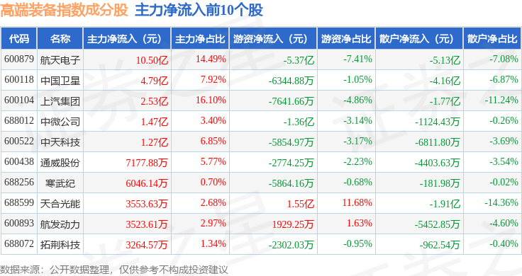 资金流向方面,高端装备(000097)指数成份股当日主力资金净流出合计73.97亿元,游资资金净流入合计23.64亿元,散户资金净流入合计50.34亿元。成份股资金流向详情见下表: