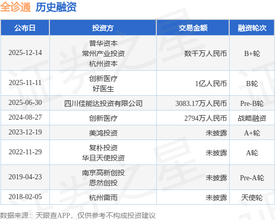 证券之星消息,根据天眼查APP于12月14日公布的信息整理,杭州全诊医学科技有限公司B+轮融资,融资额数千万人民币,参与投资的机构包括普华资本,常州产业投资,杭州资本。
