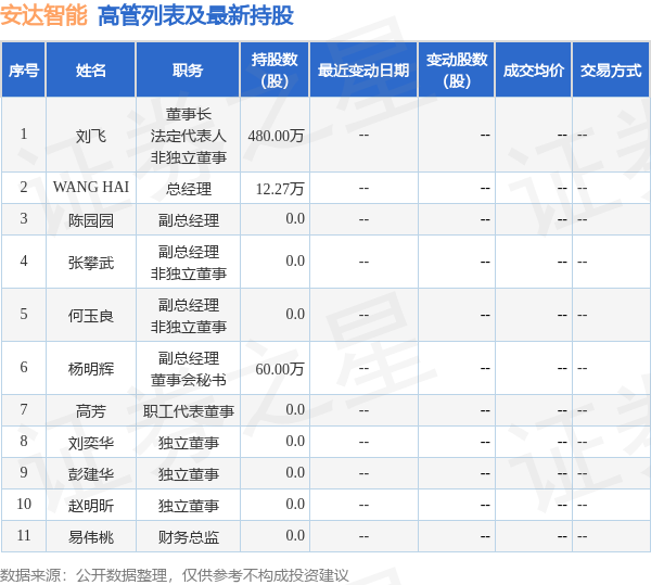 安达智能的高管列表及最新持股情况如下: