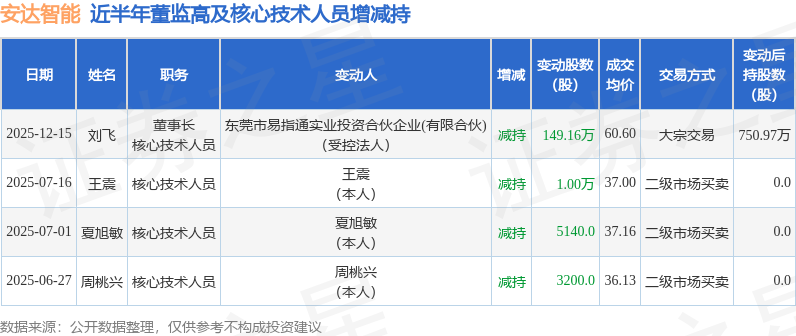 安达智能近半年内的董监高及核心技术人员增减持详情如下: