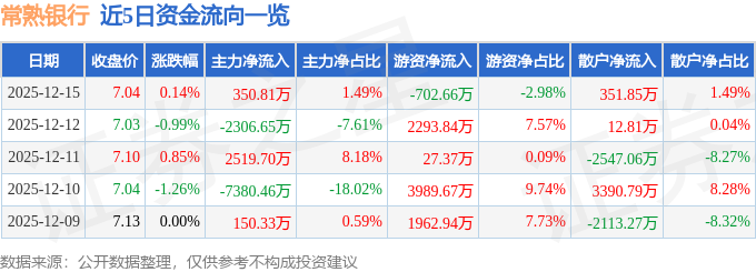 证券之星消息,截至2025年12月15日收盘,常熟银行(601128)报收于7.04元,上涨0.14%,换手率1.01%,成交量33.55万手,成交额2.36亿元。