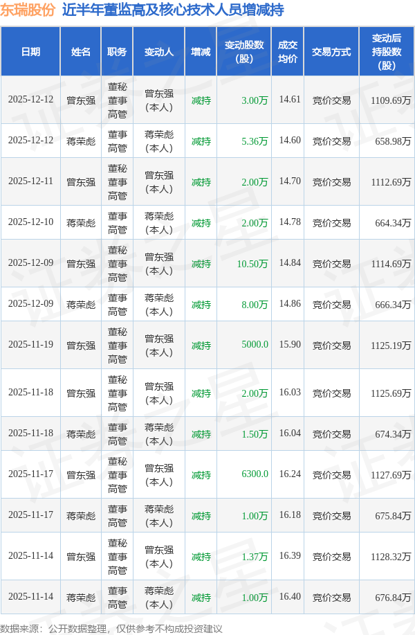 东瑞股份近半年内的董监高及核心技术人员增减持详情如下: