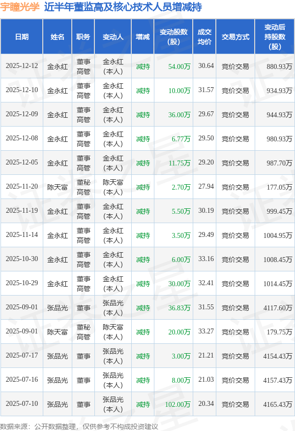 宇瞳光学近半年内的董监高及核心技术人员增减持详情如下:
