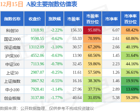 A股主要宽基指数方面,科创50的市盈率百分位较高,为95.88%。而创业板指的市盈率百分位较低,为31.05%。