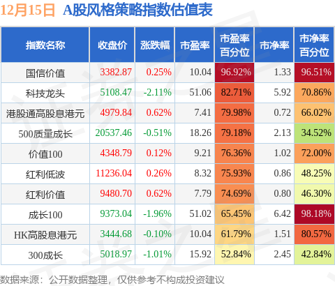 风格策略指数方面,国信价值的市盈率百分位较高,为96.92%。而300成长的市盈率百分位较低,为52.84%。