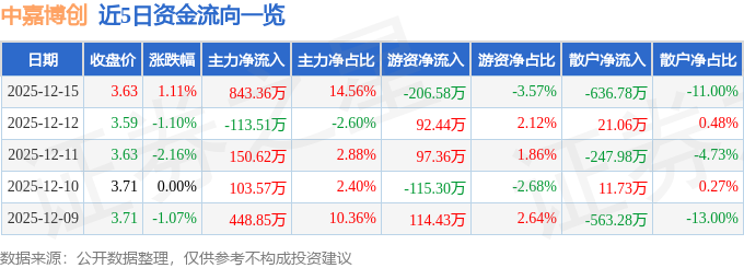 证券之星消息,截至2025年12月15日收盘,中嘉博创(000889)报收于3.63元,上涨1.11%,换手率1.84%,成交量16.04万手,成交额5790.52万元。