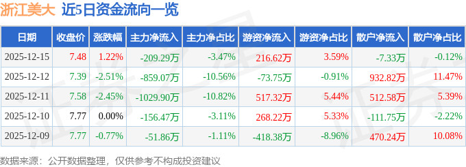 证券之星消息,截至2025年12月15日收盘,浙江美大(002677)报收于7.48元,上涨1.22%,换手率1.52%,成交量8.11万手,成交额6039.55万元。