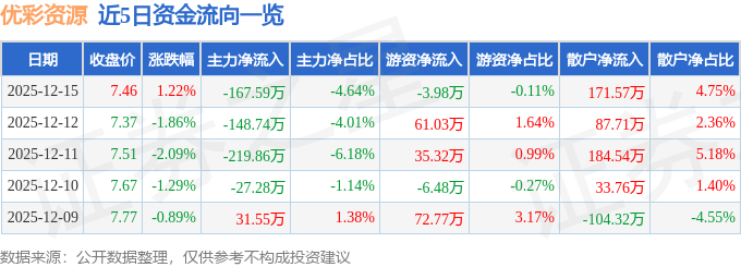 证券之星消息,截至2025年12月15日收盘,优彩资源(002998)报收于7.46元,上涨1.22%,换手率1.81%,成交量4.85万手,成交额3614.45万元。
