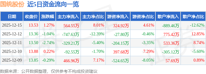 证券之星消息,截至2025年12月15日收盘,国统股份(002205)报收于13.53元,上涨1.27%,换手率2.78%,成交量5.17万手,成交额7050.39万元。