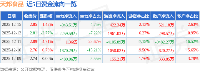 证券之星消息,截至2025年12月15日收盘,天邦食品(002124)报收于2.85元,上涨1.42%,换手率3.51%,成交量69.31万手,成交额1.99亿元。