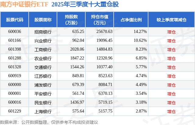 南方中证银行ETF基金成立于2017年6月28日,基金经理为孙伟,基金跟踪标的为中证银行指数,成立以来超额回报为67.47%,近一个月超额回报为0.43%。最新披露的基金持仓数据显示,截止2025年9月30日,该基金第一大重仓股为招商银行(600036),持股占比为14.27%。