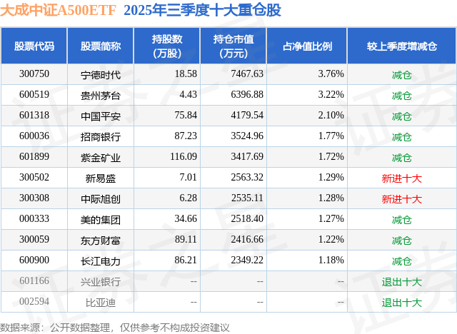 大成中证A500ETF基金成立于2024年11月22日,基金经理为刘淼,基金跟踪标的为中证A500指数,成立以来超额回报为7.0%,近一个月超额回报为0.09%。最新披露的基金持仓数据显示,截止2025年9月30日,该基金第一大重仓股为宁德时代(300750),持股占比为3.76%。