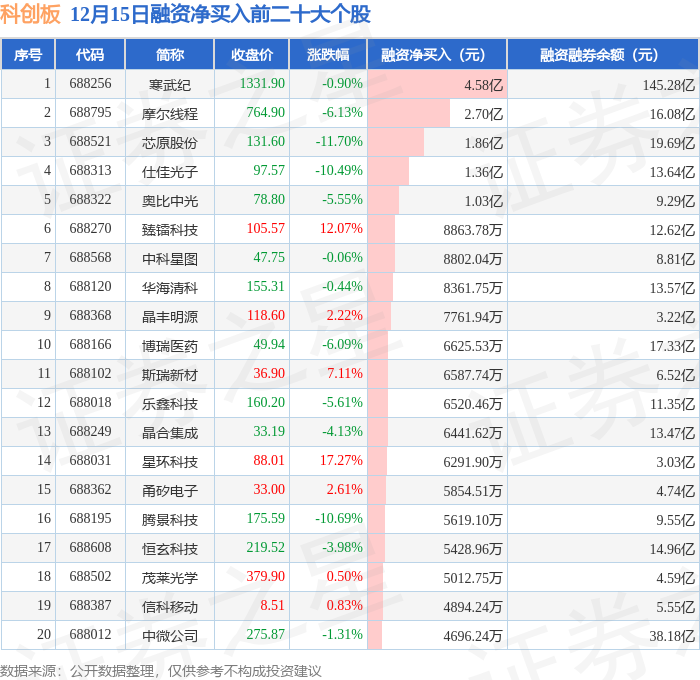 科创板融资净买入前三分别为:寒武纪(688256)融资净买入4.58亿元、摩尔线程(688795)融资净买入2.7亿元、芯原股份(688521)融资净买入1.86亿元,前20具体见下表: