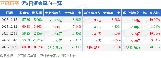 证券之星消息,截至2025年12月15日收盘,立讯精密(002475)报收于57.36元,下跌5.0%,换手率1.69%,成交量122.67万手,成交额71.44亿元。