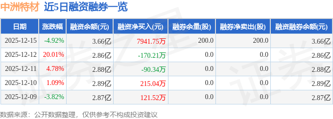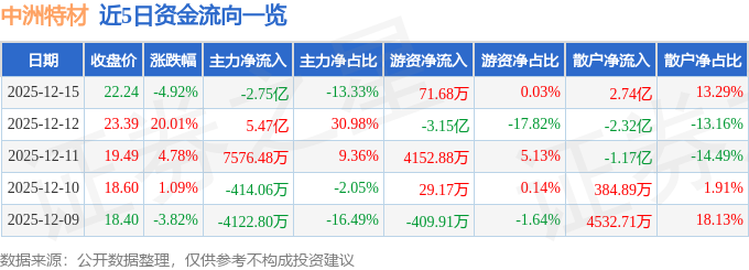 证券之星消息,截至2025年12月15日收盘,中洲特材(300963)报收于22.24元,下跌4.92%,换手率31.05%,成交量89.87万手,成交额20.65亿元。