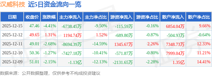 证券之星消息,截至2025年12月15日收盘,汉威科技(300007)报收于47.46元,下跌4.41%,换手率5.21%,成交量14.76万手,成交额7.09亿元。