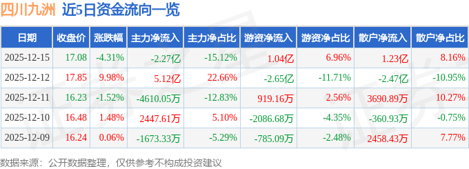 证券之星消息,截至2025年12月15日收盘,四川九洲(000801)报收于17.08元,下跌4.31%,换手率8.62%,成交量87.59万手,成交额15.02亿元。