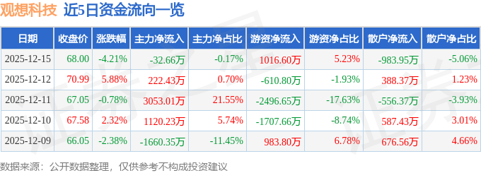 证券之星消息,截至2025年12月15日收盘,观想科技(301213)报收于68.0元,下跌4.21%,换手率5.54%,成交量2.86万手,成交额1.95亿元。