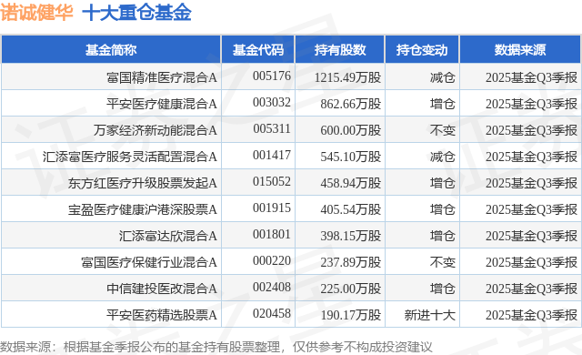 根据2025基金Q3季报公募基金重仓股数据,重仓该股的公募基金共30家,其中持有数量最多的公募基金为富国基金的富国精准医疗混合A。富国精准医疗混合A目前规模为34.91亿元,最新净值3.1742(12月15日),较上一交易日下跌3.71%,近一年上涨34.53%。该公募基金现任基金经理为赵伟。赵伟在任的基金产品包括:富国核心趋势混合A,管理时间为2023年5月16日至今,期间收益率为49.19%;富国医药创新股票A,管理时间为2024年3月12日至今,期间收益率为82.65%;富国科创板两年定开混合,管理时间为2024年4月23日至今,期间收益率为80.02%。