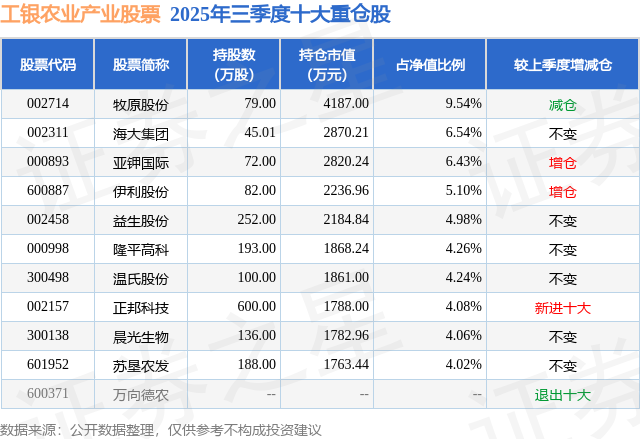 根据2025基金Q3季报公募基金重仓股数据,重仓该股的公募基金共10家,其中持有数量最多的公募基金为工银瑞信基金的工银农业产业股票。工银农业产业股票目前规模为4.39亿元,最新净值1.049(12月15日),较上一交易日上涨0.77%,近一年上涨8.59%。该公募基金现任基金经理为杨柯。杨柯在任的基金产品包括:工银景气优选混合A,管理时间为2022年8月1日至今,期间收益率为19.03%。