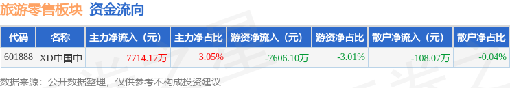 从资金流向上来看,当日旅游零售板块主力资金净流入7714.17万元,游资资金净流出7606.1万元,散户资金净流出108.07万元。旅游零售板块个股资金流向见下表: