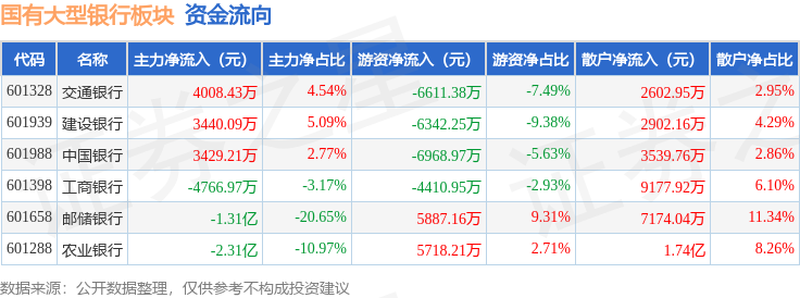 从资金流向上来看,当日国有大型银行板块主力资金净流出3.01亿元,游资资金净流出1.27亿元,散户资金净流入4.28亿元。国有大型银行板块个股资金流向见下表: