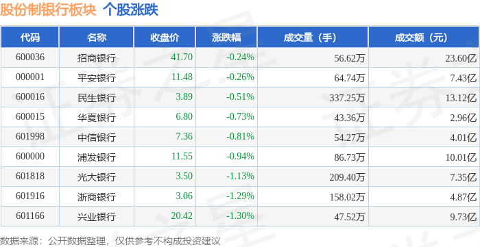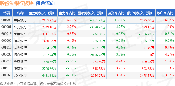 从资金流向上来看,当日股份制银行板块主力资金净流出6323.01万元,游资资金净流出1.18亿元,散户资金净流入1.81亿元。股份制银行板块个股资金流向见下表: