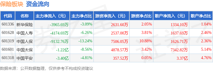 从资金流向上来看,当日保险板块主力资金净流出6.35亿元,游资资金净流入1.79亿元,散户资金净流入4.56亿元。保险板块个股资金流向见下表: